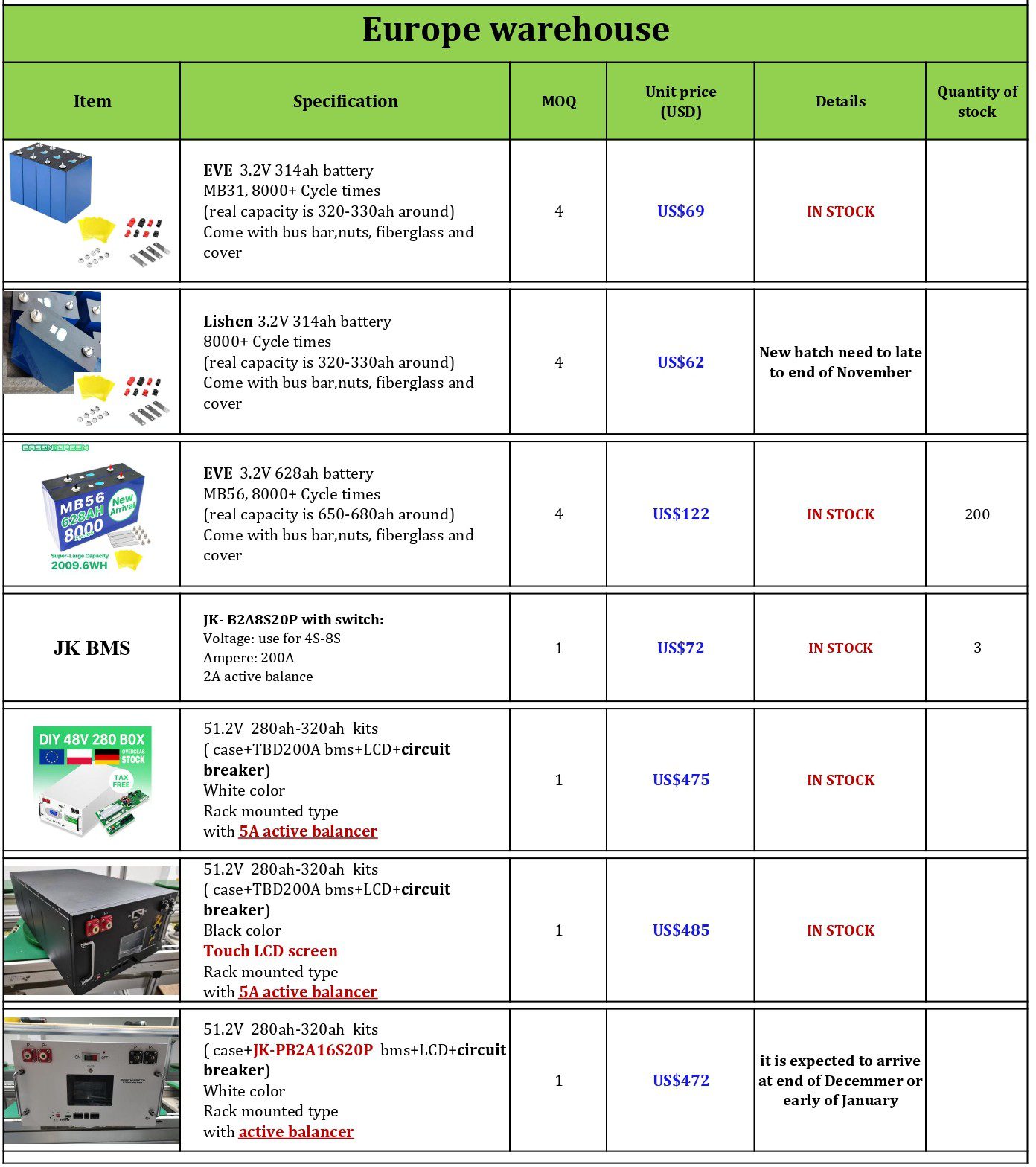 - (Ejemplo: Hello sheila, good day, I come from the group DIY LiFePO4 Batteries Spain, I want XX Cells EVE 280ah), si queremos las celdas desde el almacén Europeo también hay que indicárselo (from European warehouse), EN EL ALMACÉN EUROPEO SOLO ESTÁN DISPONIBLES LAS QUE SE INDICAN EN LA IMAGEN DE ARRIBA.